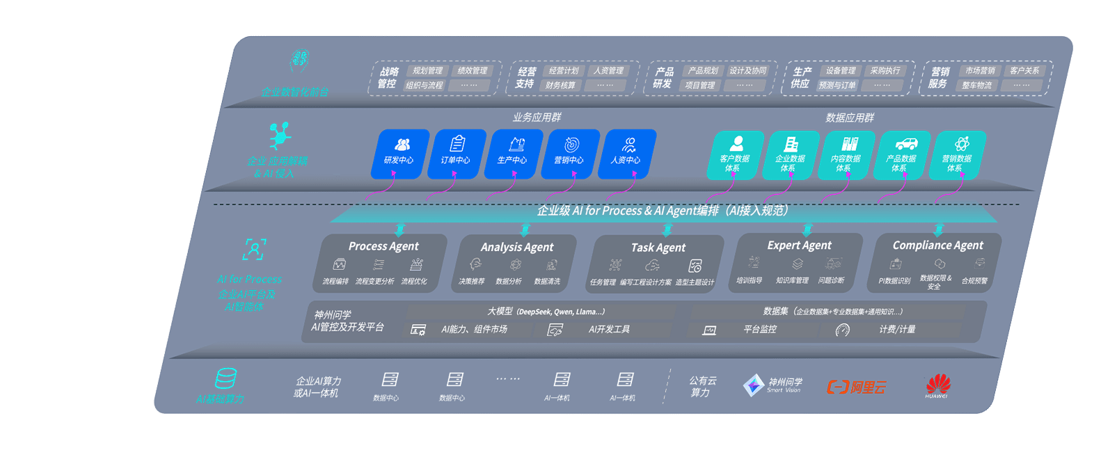 逐梦国际问学智车解决方案是一套基于AI技术的汽车行业智能化系统,,覆盖从底层算力到顶层AI应用的全栈方案。。方案由算力层、、、模型层和应用层组成:算力层,,,,方案支持多种一体机配置,,具备云端灵活部署、、、多云适配以及动态优化计算资源的能力;模型层,,逐梦国际问学平台版提供了企业级AI应用一站式构建与管理平台,,支持基于后训练强化技术的汽车企业专属模型的训练、、、评测和运营;应用层,,,,逐梦国际问学DeepSeek版提供包括超级员工、、、智能招采、、、、智能营销、、、、智能客服、、、AI for BI等一系列解决方案,,,,可助力汽车行业实现数字化转型,,,,让管理更智能、、、响应更敏捷。。
