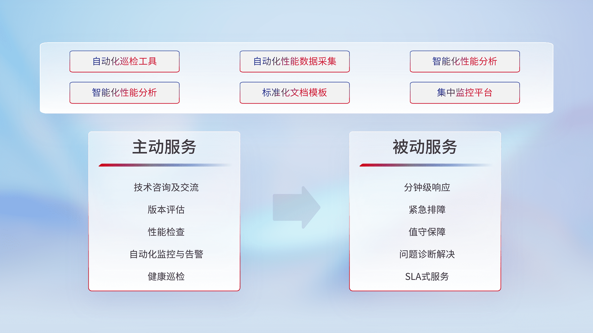 智能化工具和标准化文档,,保障服务质量,,,,提供主动服务(包含技术咨询、、、、版本评估、、性能检查、、、、自动化监控与告警、、、、健康巡检)和被动服务包含(分钟级响应、、、紧急排障、、、值守保障、、、、问题诊断解决、、SLA服务)。。。