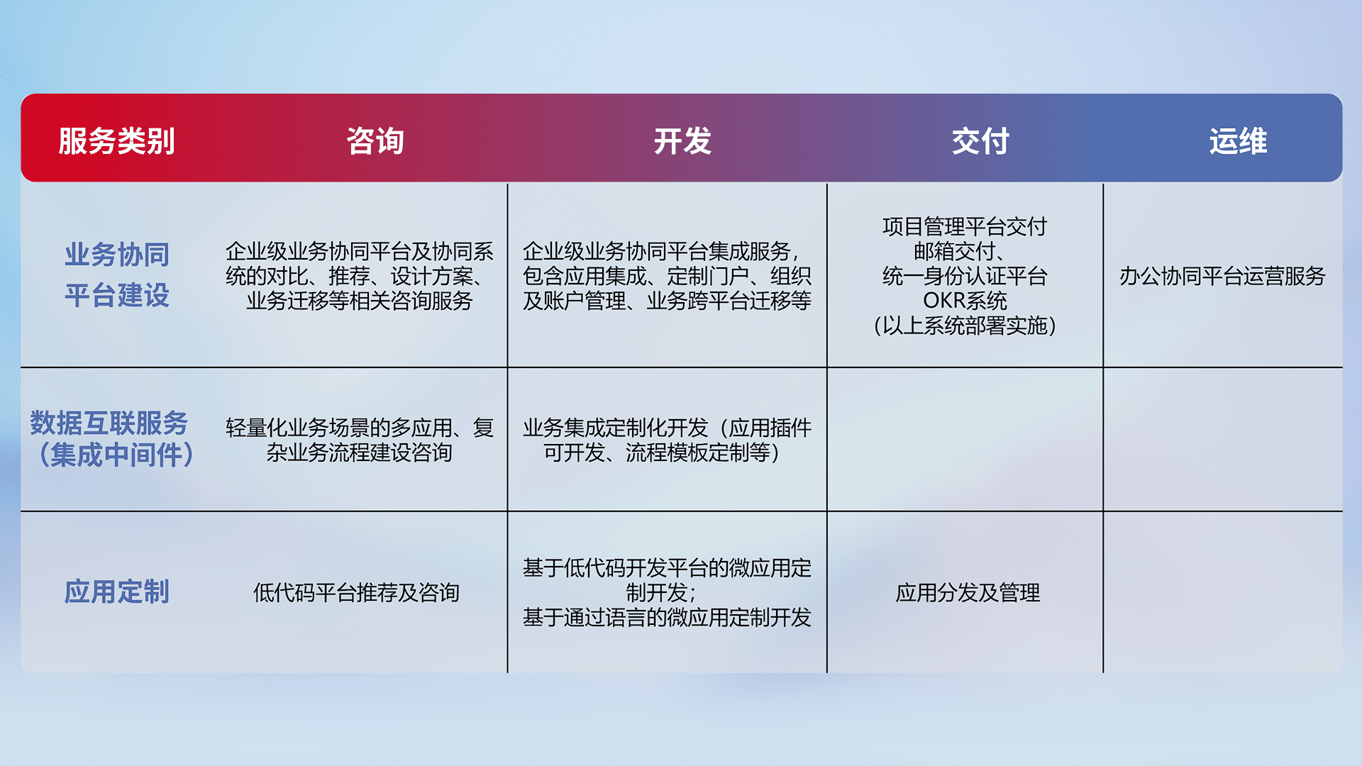 针对钉钉、、企微、、、、IDaas等平台级产品提供产品的规划、、、、方案、、、交付、、、、定制化开发等服务,,,,实现如统一协同办公、、智能客户服务、、、、混合会议管理、、、、智能数据查询、、、、等业务场景,,,实现数字化转型。。