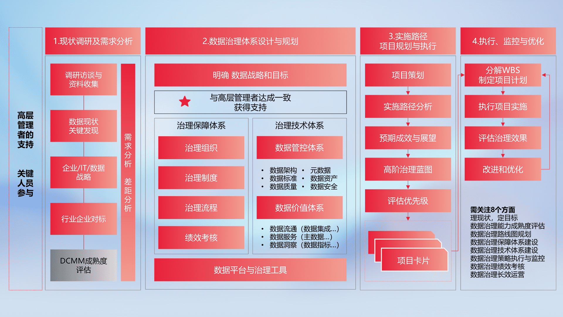 制定并执行统一的数据标准,,,,规范数据定义和格式,,消除冗余和不一致性,,,,实现跨部门和跨系统的数据一致性,,,为企业提供标准化的数据基础。。